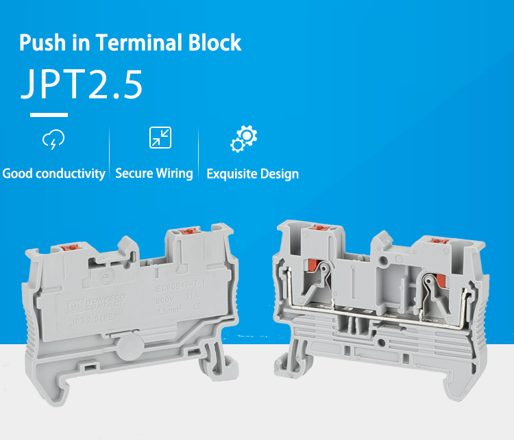 Push-in JPT 2.5 Blocage comme une solution de connexion électrique sans outil, les utilisateurs doivent seulement pousser le câble pour établir un circuit stable. JPT 2,5 Terminal Block Le terminal JPT 2,5 est fait de matériau de plastique ou de métal de qualité ingénierie avec une résistance à haute température et une résistance à la corrosion pour assurer un fonctionnement durable et fiable dans plusieurs environnements.