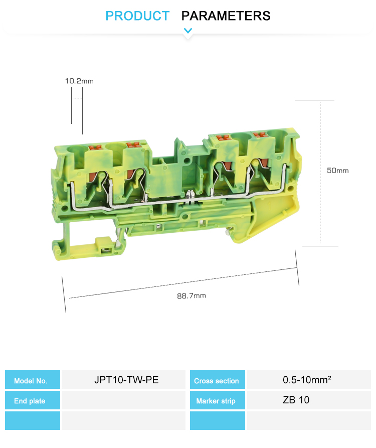 Le bloc de mise à la terre multi-conducteur sans conducteur PT10-TW-PE révolutionne les solutions de mise à la terre: la conception sans vis qui se verrouille sur push-in termine des connexions très fiables en quelques secondes, éliminant le risque de relâcher et de supporter la connexion simultanée de plusieurs conducteurs pour répondre aux exigences complexes des systèmes électriques modernes. Les matériaux de haute qualité sont hautement conducteurs, résistants aux vibrations, à la température élevée et à la contrainte mécanique. La conception compacte convient aux scénarios liés à l'espace. Il est efficacement appliqué dans des champs tels que les équipements industriels, les centres de données et l'automatisation du bâtiment, offrant aux ingénieurs une option de mise à la terre pratique et haute performance.