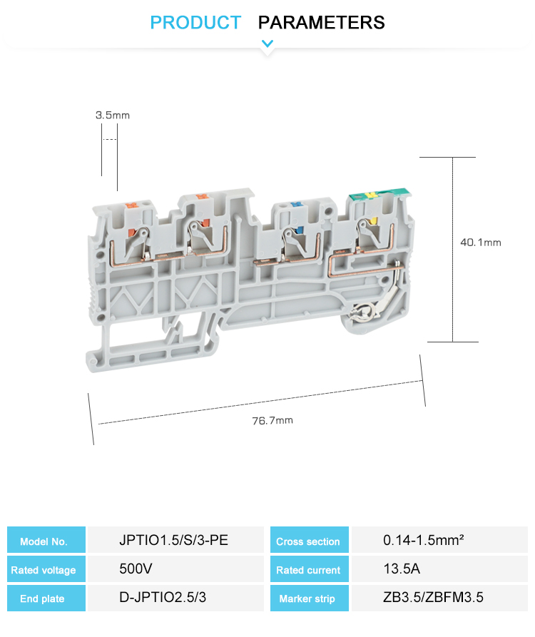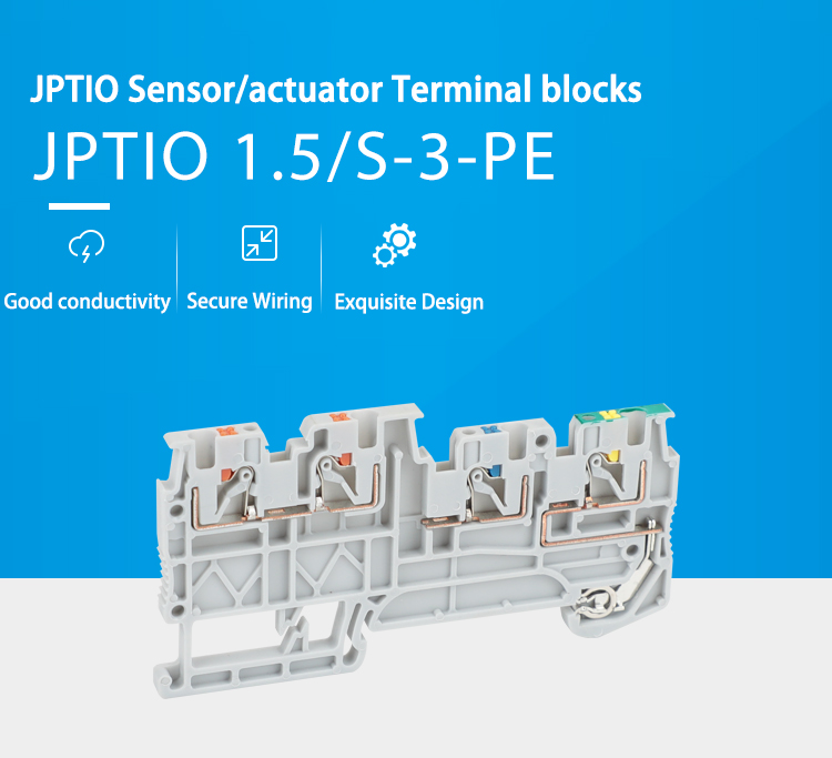 « Bornier » JPTIO1.5/S/3-PE Le « bornier » adopte du nylon ignifuge PA66, un conducteur en laiton et un ressort de compression en acier inoxydable pour garantir la sécurité électrique et la résistance mécanique dans des conditions de travail difficiles.