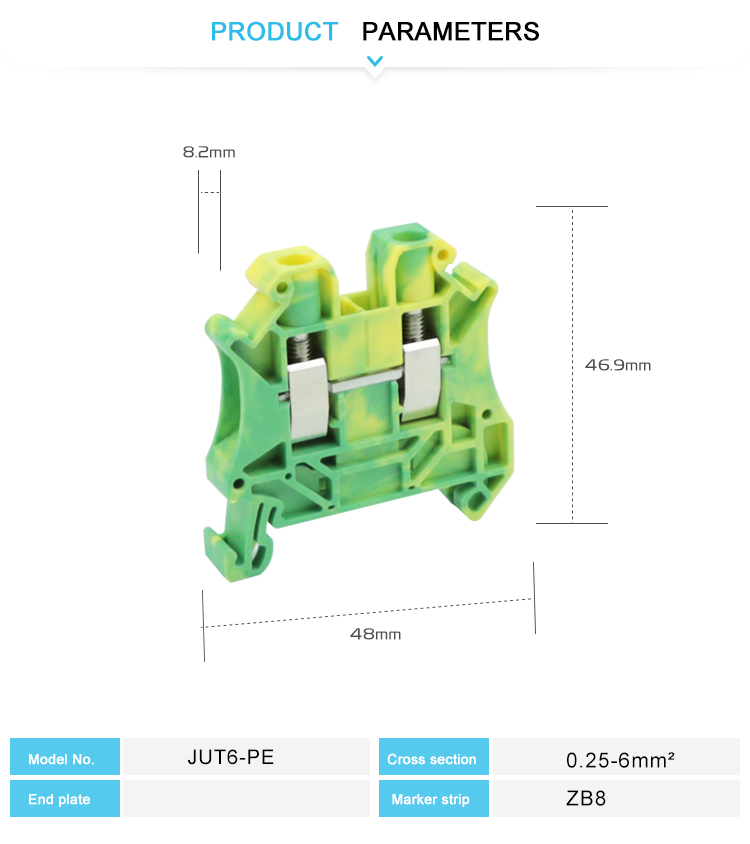 Le terminal UT6-PE haute performance est spécialement conçu pour une mise à la terre fiable dans l'industrie et le commerce, et est facile à installer avec Din Rails. La connexion à vis est anti-vibration et étanche à l'air, compatible avec des fils de cuivre fixe / torsadé. Les matériaux ignifuges de haute qualité sont résistants à la chaleur et résistants à l'impact, répondant aux normes de l'industrie. Ils conviennent aux scénarios durs tels que les armoires de contrôle et les systèmes de distribution d'énergie, offrant des solutions de mise à la terre efficaces et durables.