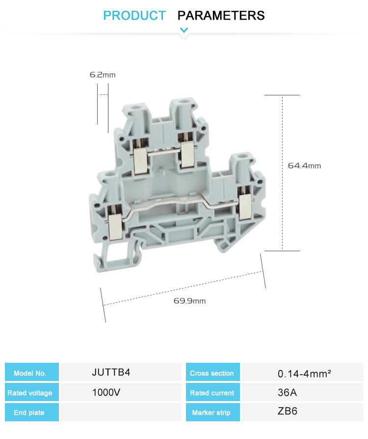 Le terminal à vis à vis à plusieurs étages de l'UTTB4 est spécialement conçu pour les scénarios de courant moyen et commercial et de courant élevé, avec une capacité de 4 mm² pour garantir des performances stables. La structure à plusieurs niveaux optimise l'espace, le rail DIN pour une installation rapide; La connexion à vis est anti-vibration et étanche à l'air compatible avec des fils de cuivre fixe / torsadé. Les matériaux ignifuges de haute qualité sont résistants à la chaleur et résistants à l'impact, répondant aux normes de l'industrie et fournissant des connexions fiables et efficaces pour les systèmes modernes.